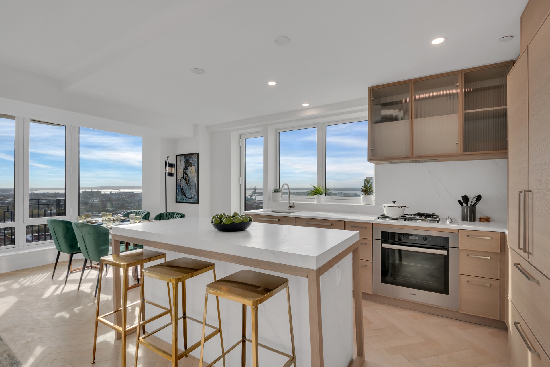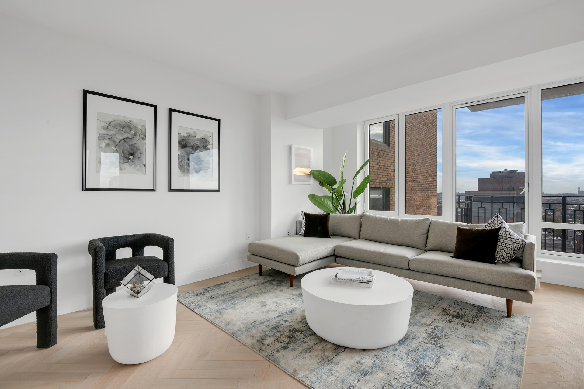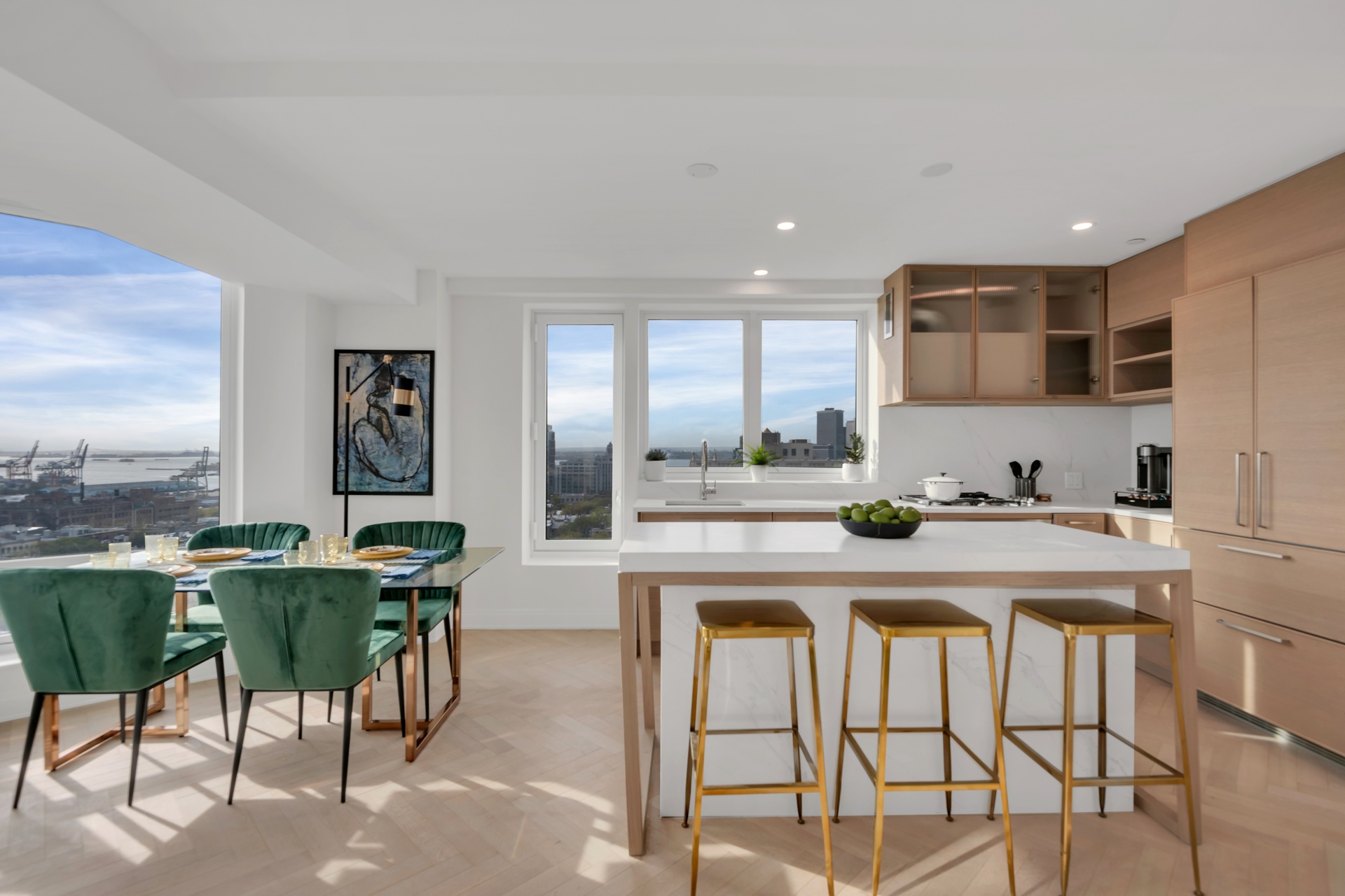 Residence 20 is a flawless floor-through home graced with luxurious finishes, a thoughtful layout and jaw-dropping NYC Skyline and water views. This beautiful 2 bedroom, 2 bathroom home is ideal for families and entertainers alike. A private, keyed elevator opens directly into this homes functional entryway foyer and flows into a spacious, open-concept living room, dining room, and kitchen. The apartment spans approximately 1,666 sq. ft. and features a private 25 sq. ft. balcony, beautiful herringbone white oak floors, LED down-lighting, in-unit washer/dryer, and radiant heated flooring in all bathrooms. The spacious living and dining area is nearly 30 feet wide and features a wall of floor-to-ceiling windows that open effortlessly onto the incredibly large balcony overlooking lush gardens below.