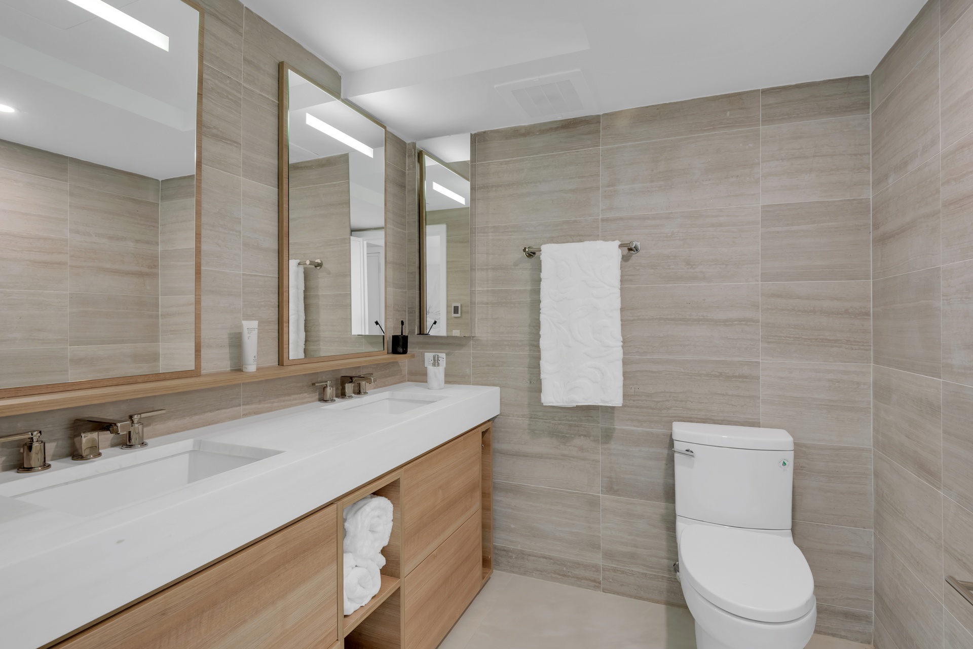The open state-of-the-art kitchen boasts an eat-in peninsula, custom soft-close wood cabinets with under-cabinet lighting, and a suite of deluxe Miele appliances. All of the homes bedrooms are conveniently located opposite the living space. The oversized corner master suite enjoys four oversized closets and a gorgeous en-suite 5 fixture master bathroom that includes a custom dual vanity sink, a walk-in shower, and a separate deep soaking tub. All bathrooms throughout the home are outfitted with high-end Kholer fixtures and Bianco Dolomiti Marble.