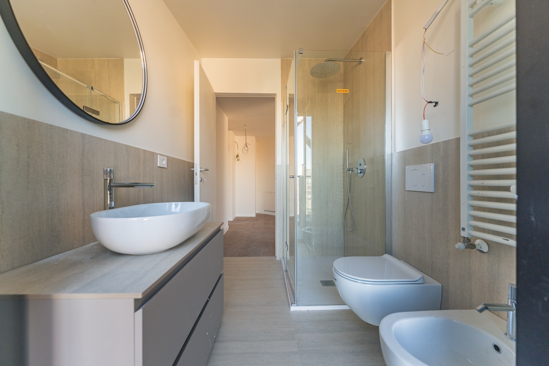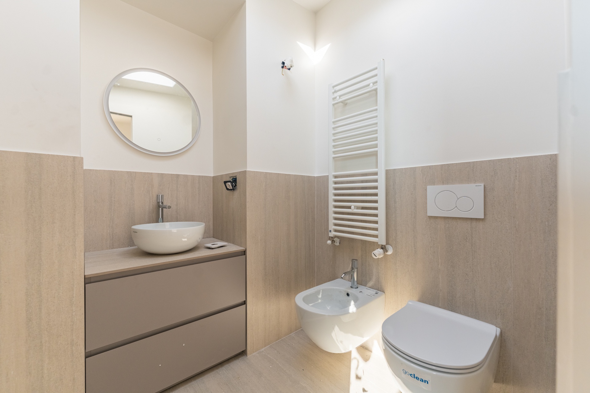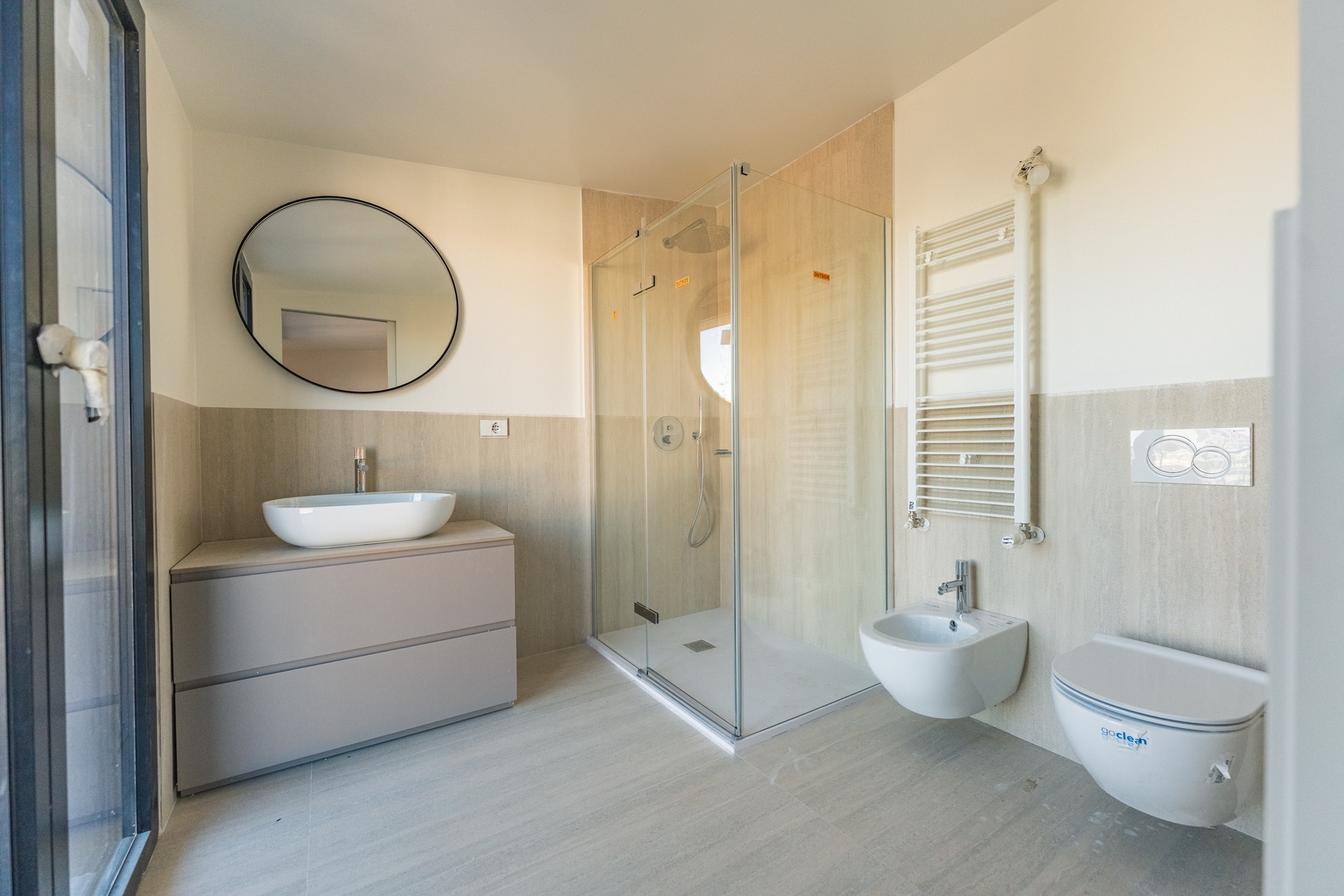 - Shower trays: Mineral, 3 cm high, made from natural mineral composites with a white gel-coated finish