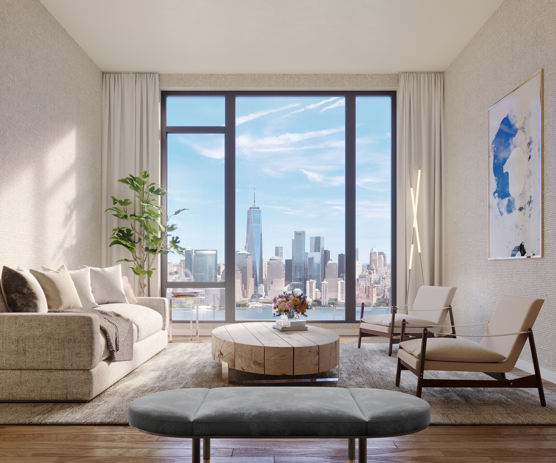 Modern condominiums feature floor-to-ceilings windows with exhilarating views of the New York skyline.