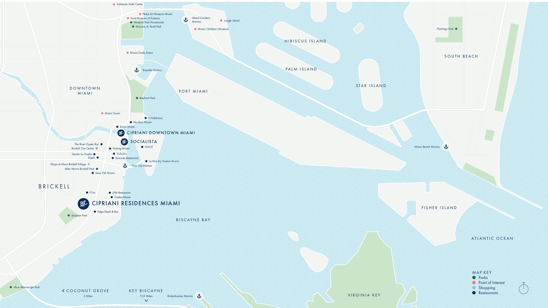 Cipriani Residences Miami will offer its residents unparalleled, resort-style amenities including an elegant porte cochère and lobby, signature private dining experiences by Cipriani, elevated resort deck with 2 swimming pools, poolside cabanas, outdoor spa and landscaped sun terrace, 4-level wellness center and lounge overlooking the Brickell skyline, holistic wellness spa with sauna and treatment rooms, salon for private beauty services, high-tech fitness center, golf simulator, pickleball court, dog park, screening room, library, children’s playroom and residents’ lounge.