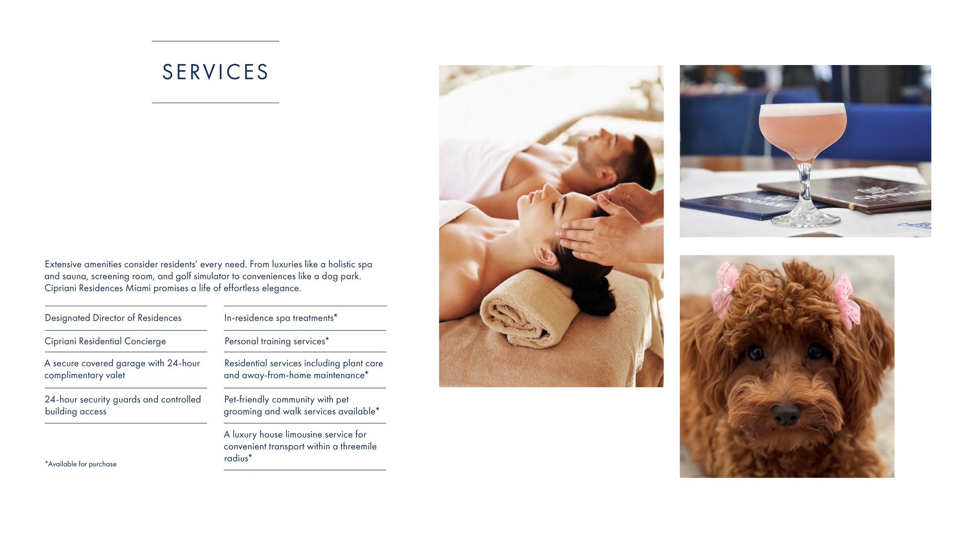 Services at Cipriani Residences will include a dedicated Director of Residences, Residential Cipriani Concierge, 24-hour catering services and in-home dining by Cipriani, poolside food and beverage services catered by Cipriani, residential services such as away-from-home maintenance, pet grooming and walking services, in-residence spa treatments, personal training services, 24-complimentary valet parking and security.