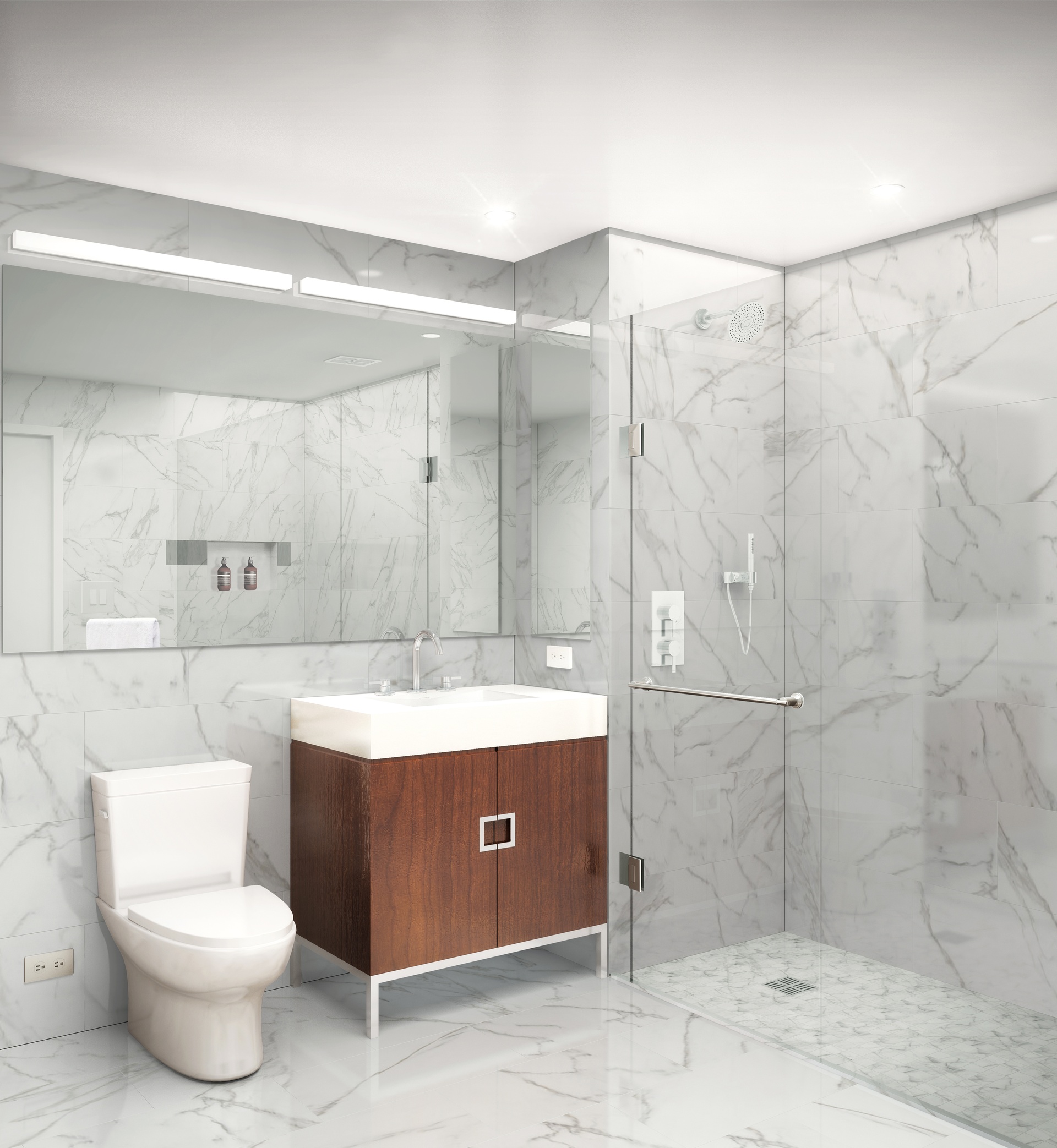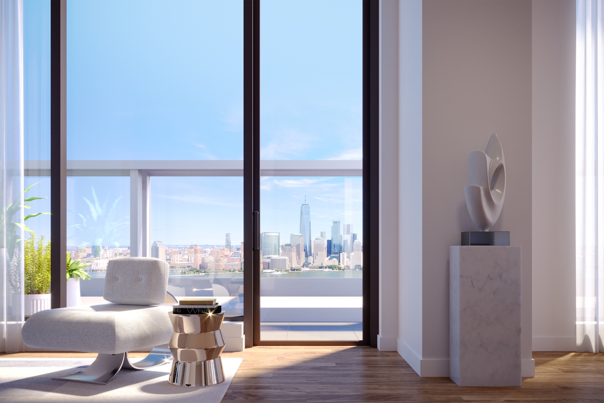 Modern condominiums feature floor-to-ceilings windows with exhilarating views of the New York skyline.