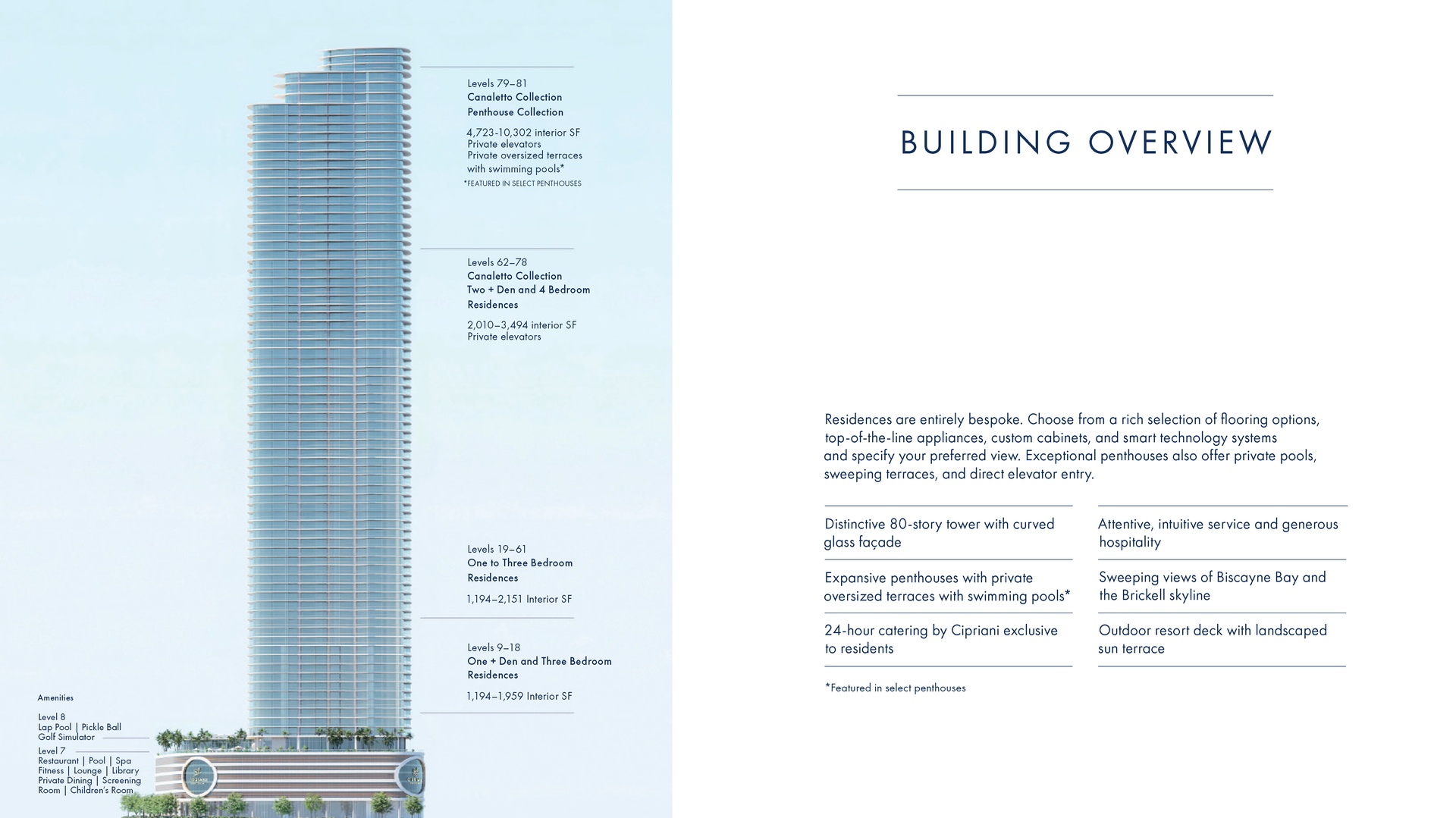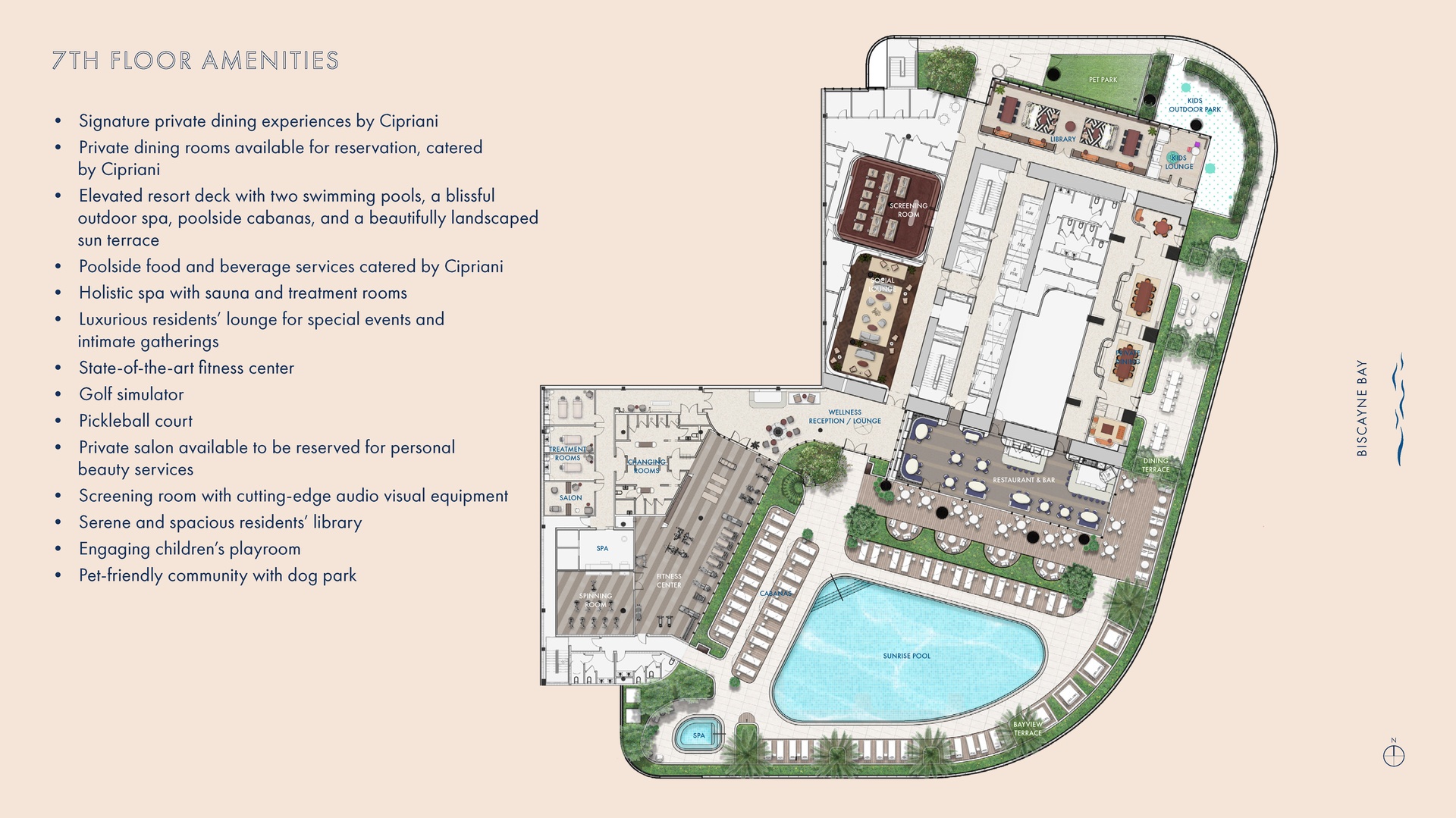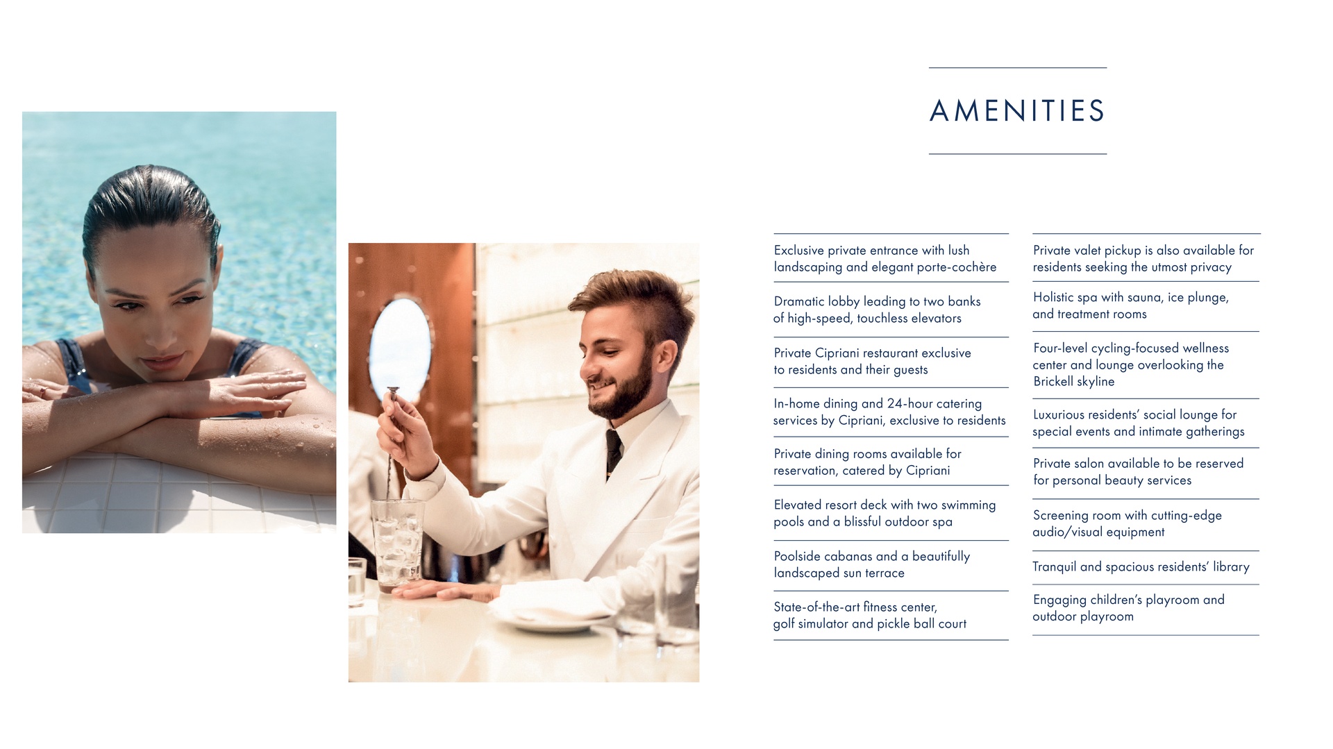 Cipriani Residences Miami will offer its residents unparalleled, resort-style amenities including an elegant porte cochère and lobby, signature private dining experiences by Cipriani, elevated resort deck with 2 swimming pools, poolside cabanas, outdoor spa and landscaped sun terrace, 4-level wellness center and lounge overlooking the Brickell skyline, holistic wellness spa with sauna and treatment rooms, salon for private beauty services, high-tech fitness center, golf simulator, pickleball court, dog park, screening room, library, children’s playroom and residents’ lounge.